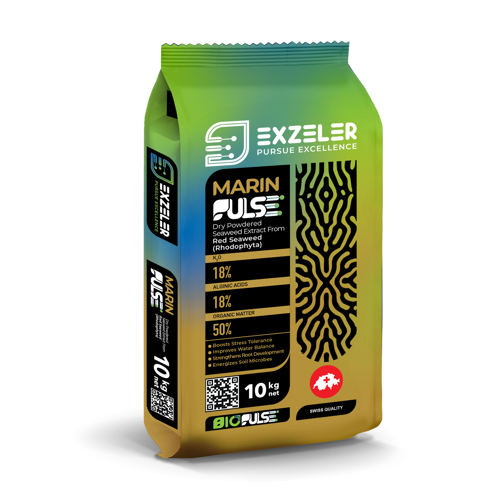 MarinPULSE is a premium powdered biostimulant made from Rhodophyta (red marine algae), containing a naturally balanced profile of bioactive compounds. The product is rich in alginic acid (18.53%), organic matter (51.33%), soluble potassium (K₂O – 18%), and naturally occurring plant growth regulators including cytokinins and gibberellins (≥600 ppm).